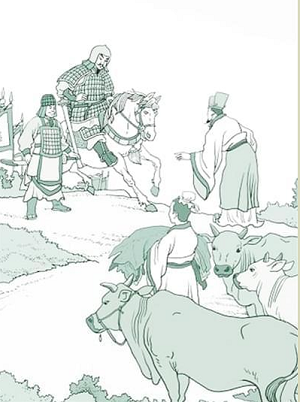 牛販子想:我能怎么不顧?quán)崌?guó)的安危呢。于是他想了一個(gè)法子,他一路走去,果然碰到了秦國(guó)的軍隊(duì)。秦國(guó)的將軍問:“你是干什么的!”牛販子回答:“我是鄭王派來的使者,鄭王知道你們要來我們鄭國(guó)做客,所以就派我來為你們送牛”。秦國(guó)的將軍一想:鄭國(guó)對(duì)我們這么好,我們還打他們,這不是沒天理嗎。說罷,便指揮軍隊(duì)調(diào)頭離開。