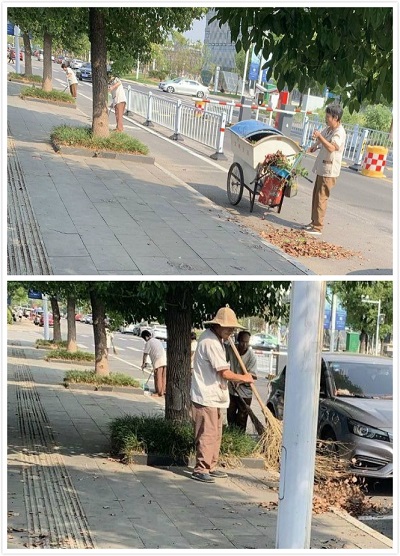 由于主干道落葉較多,有時這邊剛掃完,那邊又落滿了一地。因此外圍的保潔工一天不停地來回清掃落葉,給保潔員增加了不少的工作量。但是他們一句怨言也沒有,連續3個小時的清掃工作,汗水早已打濕他們臉頰、濕透了衣裳。這時他們就用袖子擦擦臉上的汗水,繼續干活。